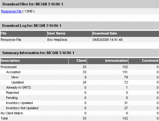 No Client Match - Number of immunizations and comments that do not match a client in a Flat File upload. These unmatched immunizations and comments are NOT processed and are NOT loaded into the Registry.